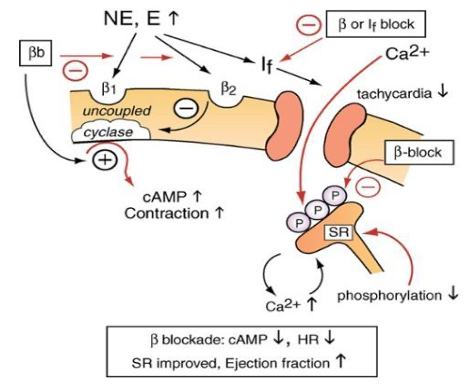 Một khi thuốc chẹn beta liên kết với các thụ thể B1 và B2 chúng sẽ ức chế các thụ thể này. Do đó, các hiệu ứng chronotropic và inotropic (tăng nhịp tim và tăng lực co bóp) trên tim sẽ bị ức chế, và kết quả là làm chậm nhịp tim. Thuốc chẹn beta cũng làm giảm huyết áp thông qua một số cơ chế, bao gồm giảm renin và giảm cung lượng tim. Các hiệu ứng giảm nhịp tim và lực co bóp cơ tim sẽ dẫn đến giảm nhu cầu oxy của tim; đó là cách cải thiện chứng đau thắt ngực sau khi sử dụng thuốc chẹn beta. Những loại thuốc này cũng kéo dài thời gian chịu đựng của tâm nhĩ và có tác dụng chống loạn nhịp tim mạnh [1].